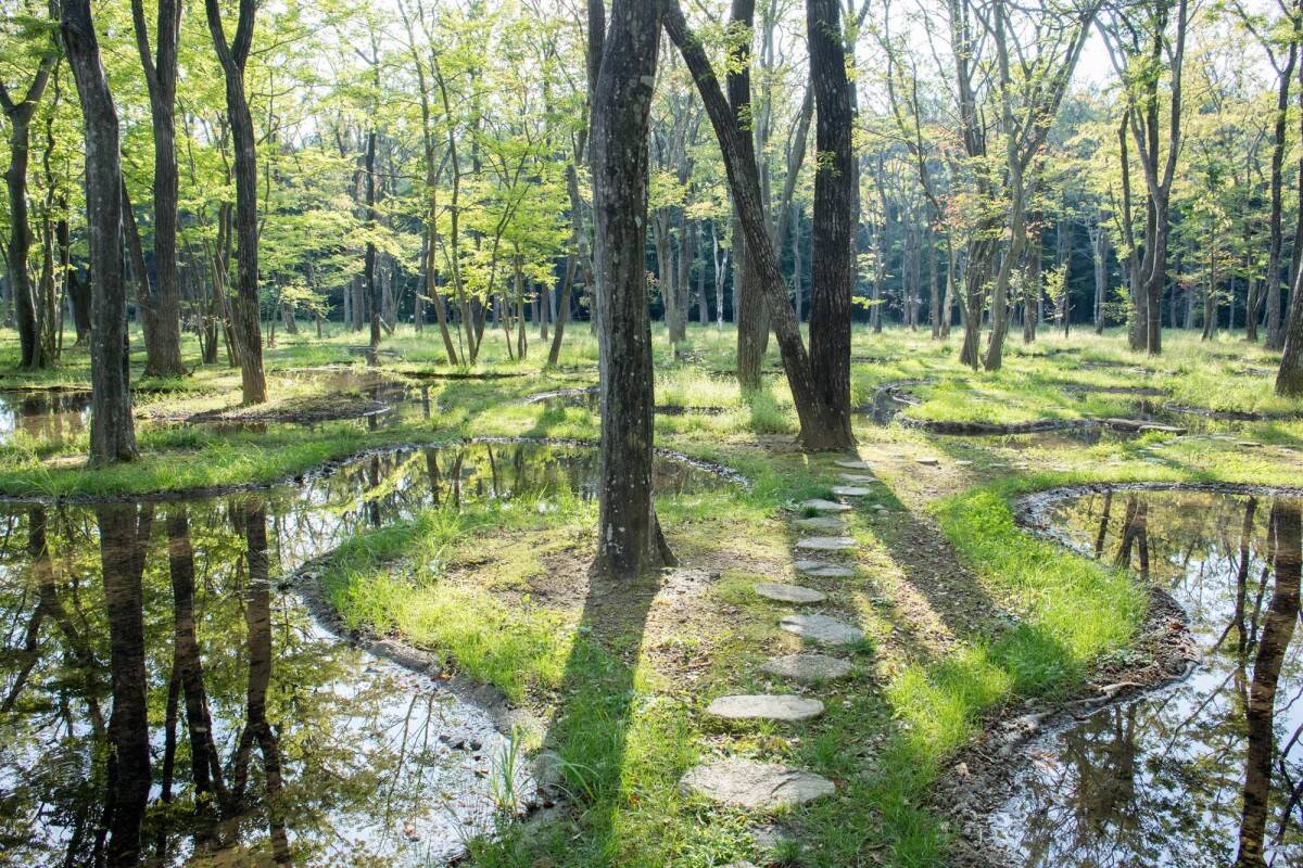 Với diện tích gần bằng nhau giữa khu rừng và đồng cỏ, kiến trúc sư Junya Ishigami đã đưa ra ý tưởng di dời cả khu rừng đến bãi cỏ bên cạnh. Bằng cách này, bãi cỏ không chỉ được chuyển đổi bởi việc di dời rừng mà còn hình thành và xuất hiện lồng ghép cùng các lớp cảnh quan từ lịch sử: Hình ảnh cánh đồng lúa và rừng rêu hòa quyện thành một. Những cây xanh từ khu rừng được bố trí lại trên địa điểm mới, với nguồn nước từ cống dẫn sẵn có để tạo thành các ao hồ kết nối với hệ thống tưới tiêu khiến dòng nước chảy liên tục nhịp nhàng và uyển chuyển.