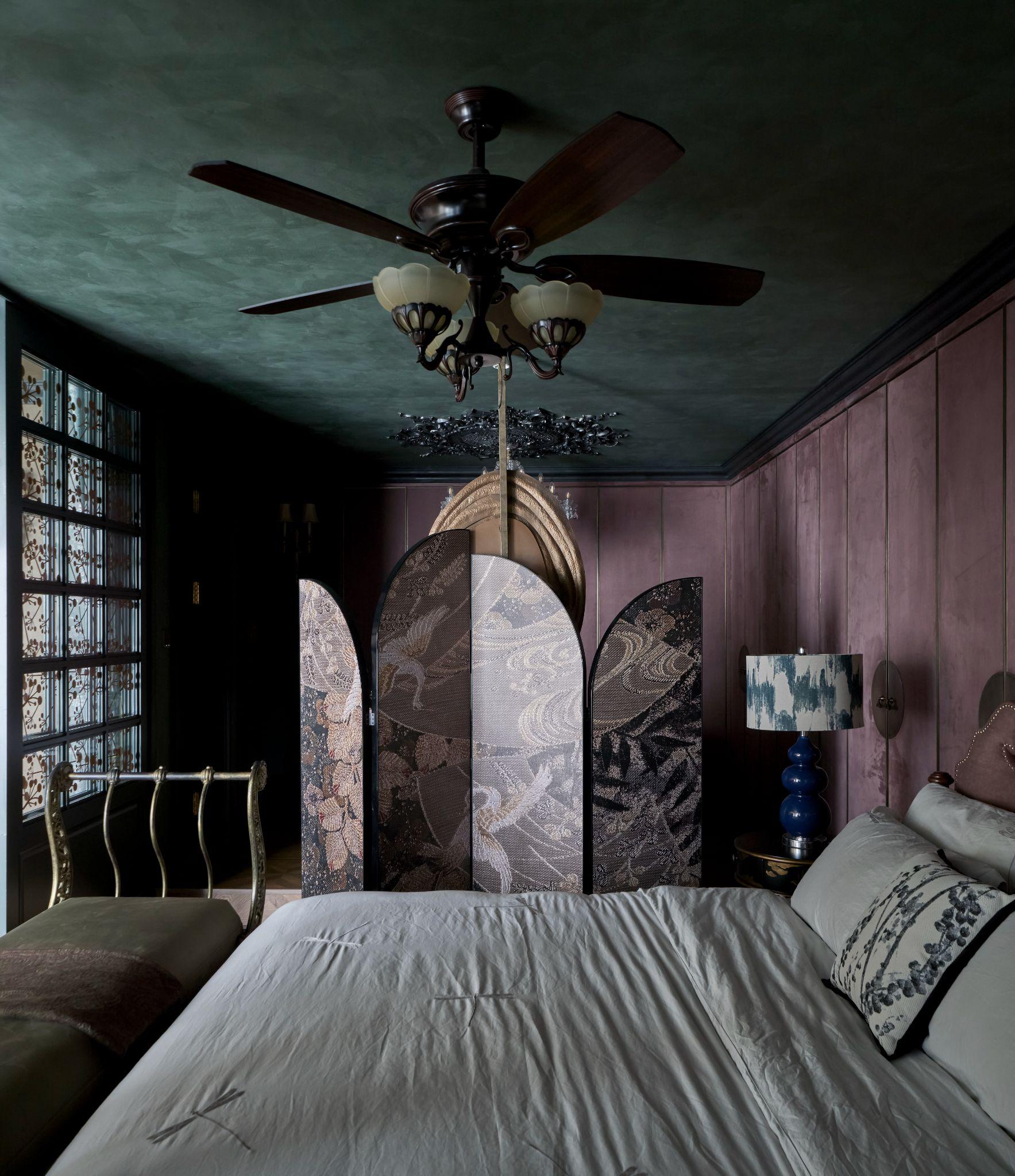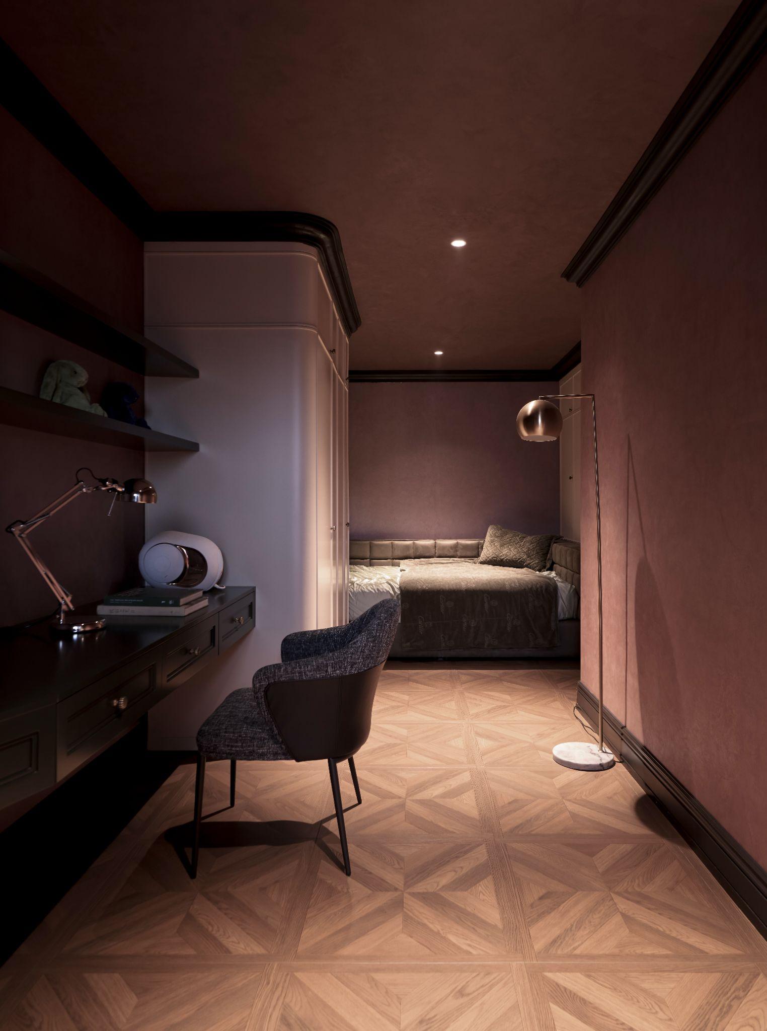 Trần nhà màu xanh rêu – một sắc độ không dễ nắm bắt, nhưng lại khiến người ta muốn ngẩng lên nhìn. Bức tường đỏ thẫm – như nhấn nhá một chút chiều sâu của ký ức. Sàn gỗ sồi âm ấm dưới chân và vách kính ánh vàng phản chiếu ánh sáng ban mai như một lớp bụi óng. Tất cả đều là màu nhưng không đơn thuần là màu. Chúng là bề mặt, là xúc giác, là không khí, là cảm giác đi qua cơ thể.